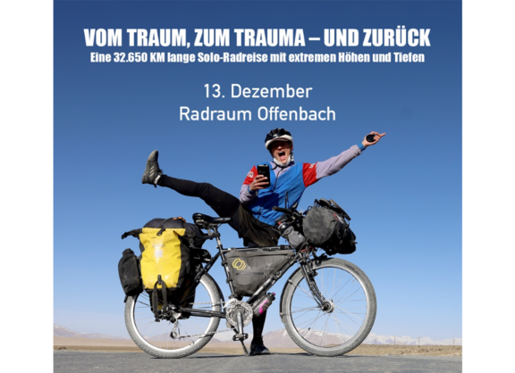 Eine 32.615 km lange Solo-Radreise mit extremen Höhen und Tiefen. Ein Radreisevortrag von und mit Lisa Achatzi im Radraum in Offenbach. In einem Film und Vortrag nimmt Lisa uns mit auf eine Reise durch 25 Länder auf vier Kontinenten.