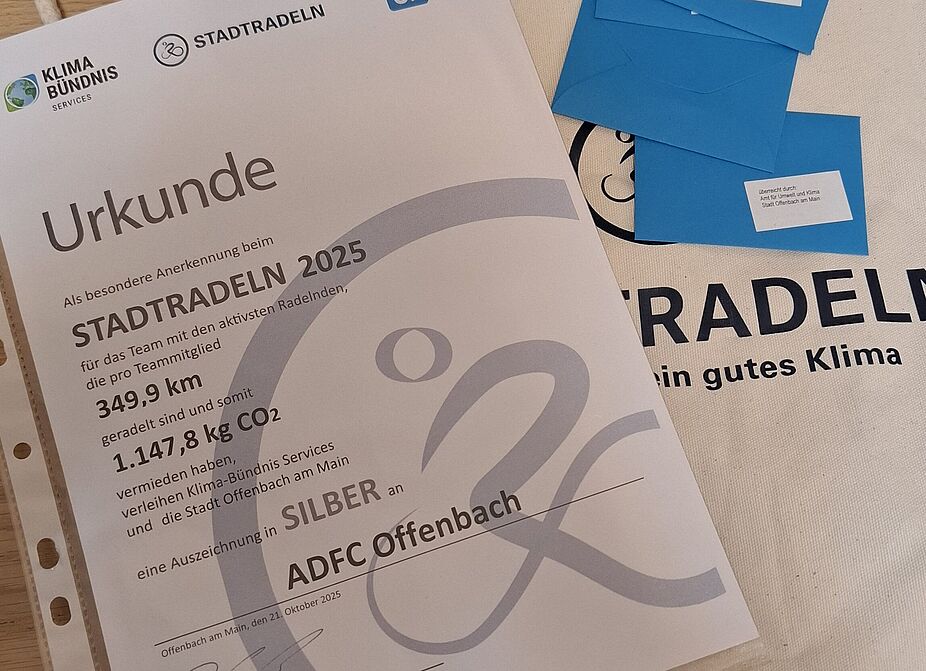 Mega Performance vom Radl-Team beim Stadtradeln in Offenbach. Das Team des ADFC-Offenbach hat mit 349,9 gefahrenen Kilometern pro Kopf in der Kategorie aktivstes Team pro Teammitglied eine Auszeichnung in Silber bekommen.