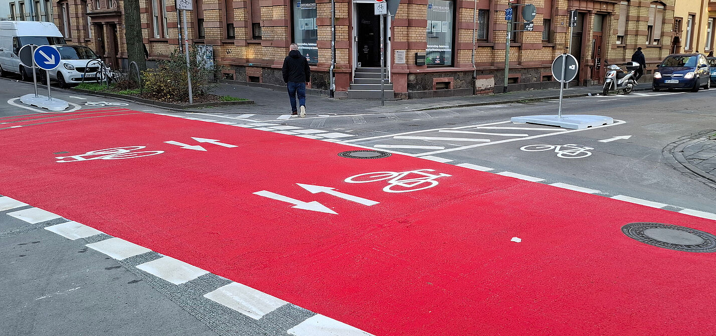Mit der baulichen Umgestaltung der Kreuzung Bleichstraße / Friedrichstraße sorgt die Stadt Offenbach für mehr Sicherheit für Radfahrende. An dieser Kreuzung kam es in der Vergangenheit immer wieder zu Unfällen zwischen Radfahrenden und Autos.